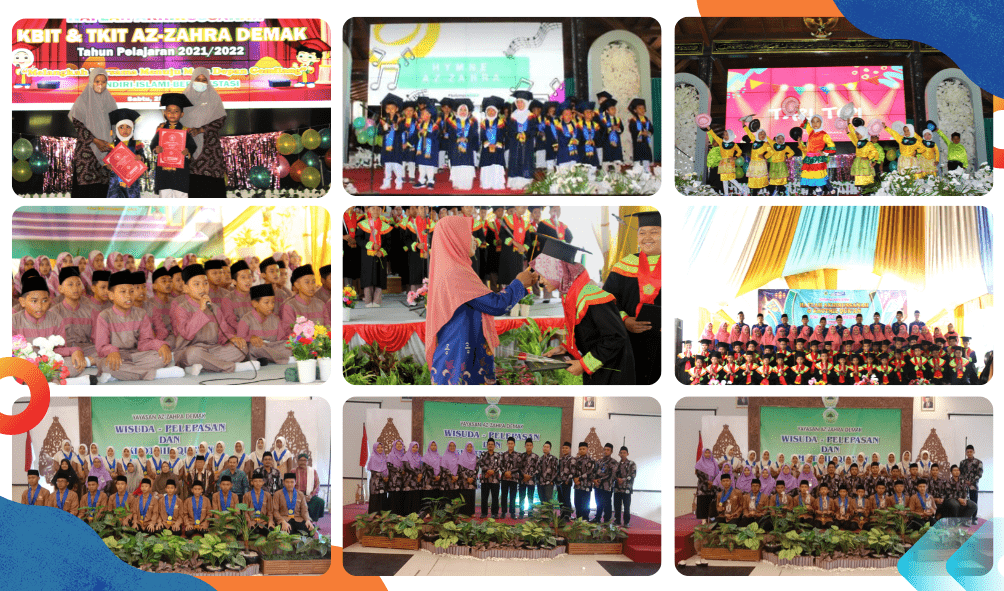 Alhamdulillah pada bulan Mei-Juni lalu, prosesi wisuda Az-Zahra Demak pada tahun pelajaran 2021/2022 berlangsung dengan baik setelah melewati peristiwa covid-19 tahun lalu. Az-Zahra meluluskan siswa-siswi dari KB, TK, SD, dan SMP. Prosesi acara tersebut dilaksanakan di tempat yang berbeda dengan waktu yang berbeda pula. Pada prosesi wisuda SMPIT AZ-ZAHRA dilaksanakan pada hari Sabtu [28/05/2022], digelar di hotel Amantis dengan jumlah yang lulus sebanyak 24 siswa. Prosesi wisuda SDIT AZ-ZAHRA sendiri dilaksanakan pada hari Sabtu [04/06/2022], di halaman SDIT AZ-ZAHRA dengan jumlah 74 siswa yang lulus. Sedangkan KB dan TK dilaksanakan secara bersamaan di Pendopo Kab. Demak hari Sabtu [25/06/2022] dengan siswa KB sebanyak 21 siswa yang lulus dan siswa TK sebanyak 61 siswa yang lulus.